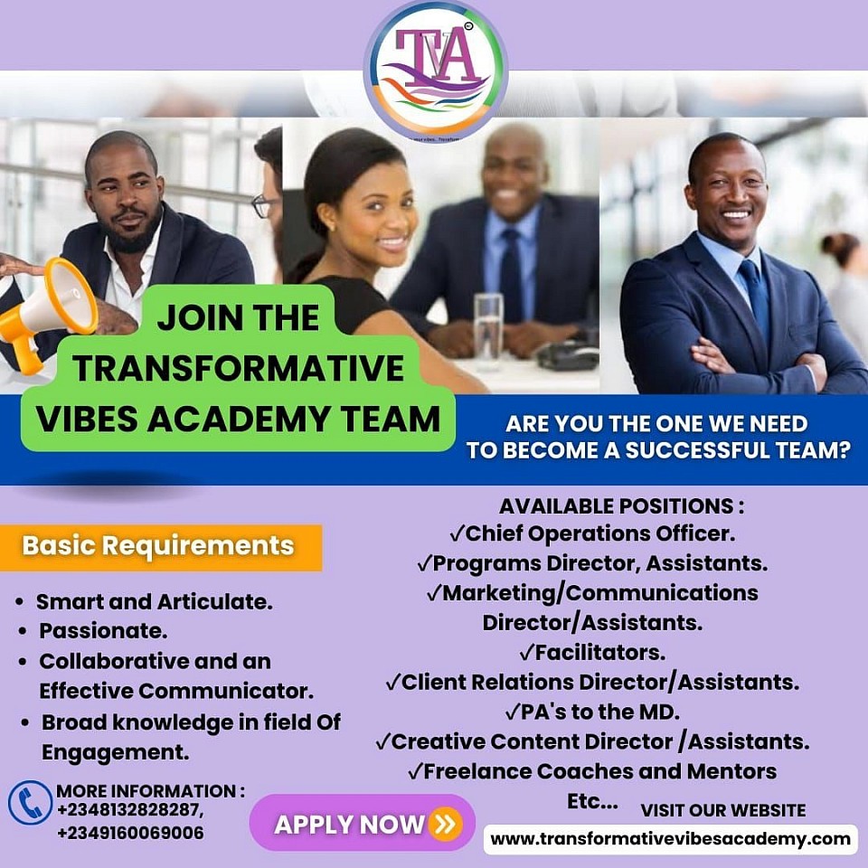 Are you passionate about inspiring change, driving impact, and empowering individuals to reach their full potential? Transformative Vibes Academy (TVA) is looking for talented, visionary professionals to join our dynamic team in the following roles: